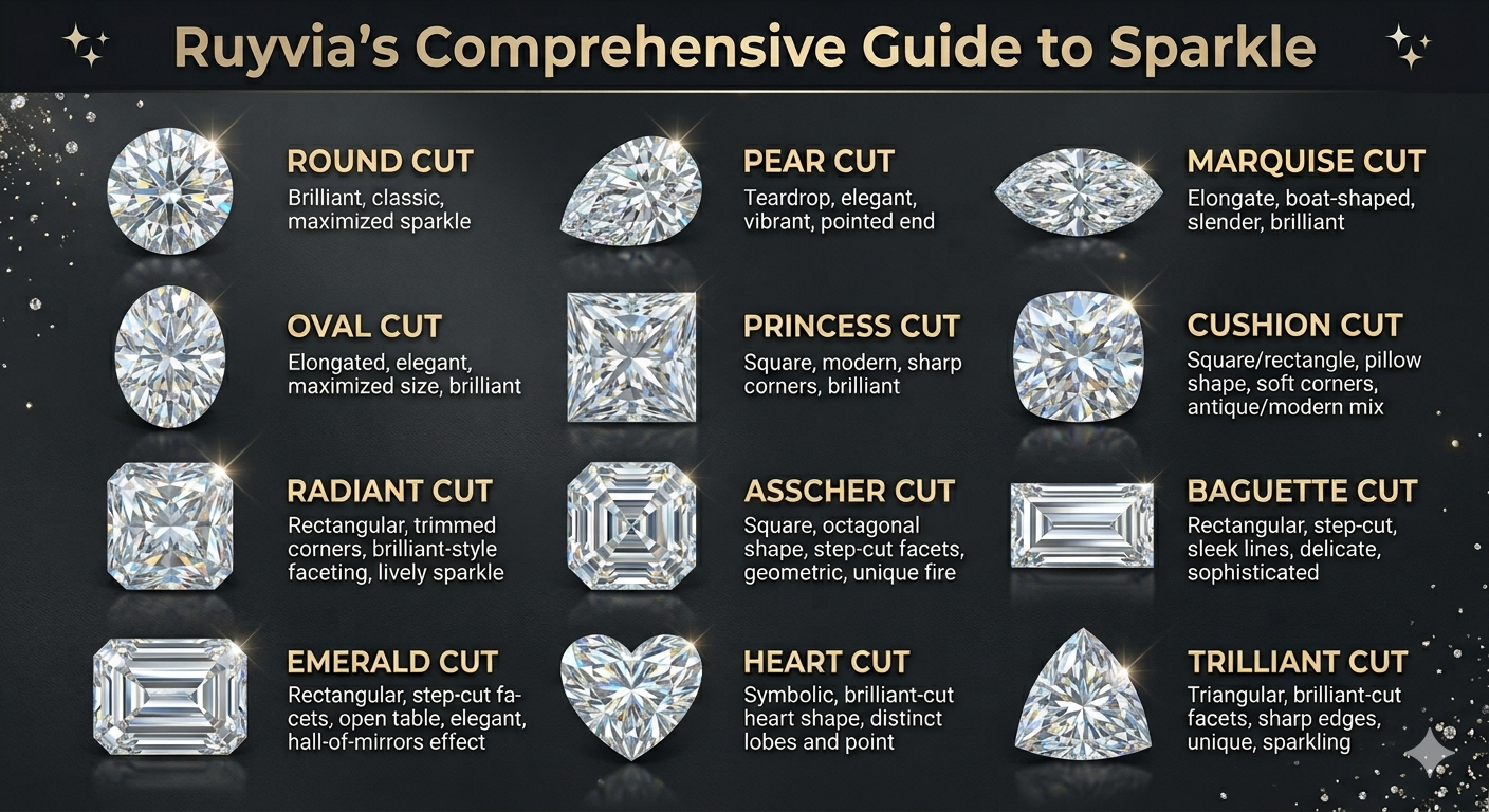Emerald & Asscher (Step Cuts): These feature long, parallel facets that create a "hall-of-mirrors" effect. They focus on clarity and depth rather than flashy sparkle.